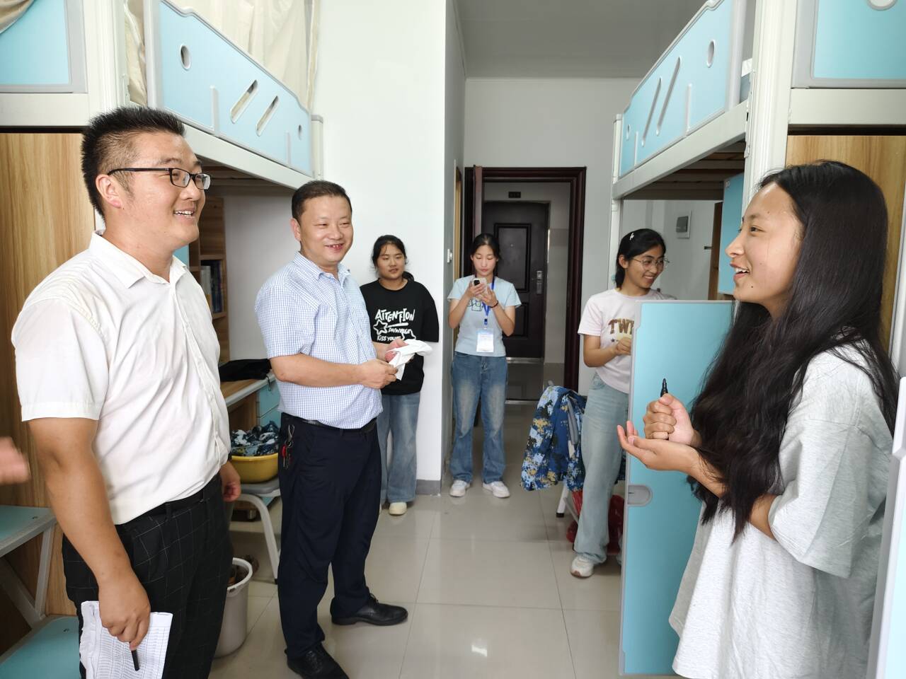 通过此次走访,学院领导和新生辅导员对新生住宿情况有了进一步的了解,拉近了师生之间的距离,引导新生尽早融入老员工活,树立人生目标,明确奋斗方向,增强了新生对学院的认同感和归属感,为学院工作顺利开展奠定了坚实基础。(撰稿:储晶晶 汪子莹 摄影:汪子莹 方欣铜 编辑:田梦甜 审核:田梦甜 邹斌 )