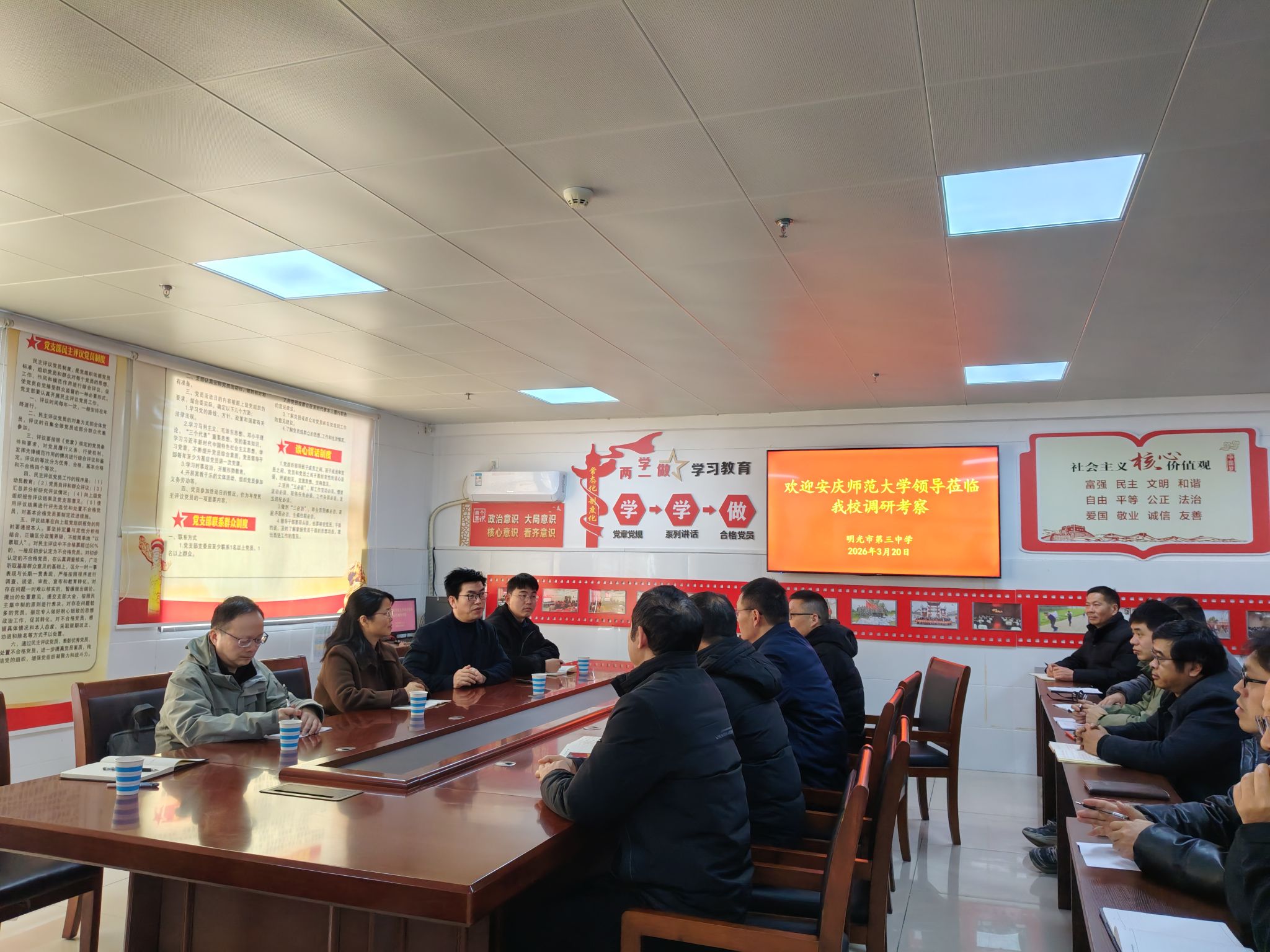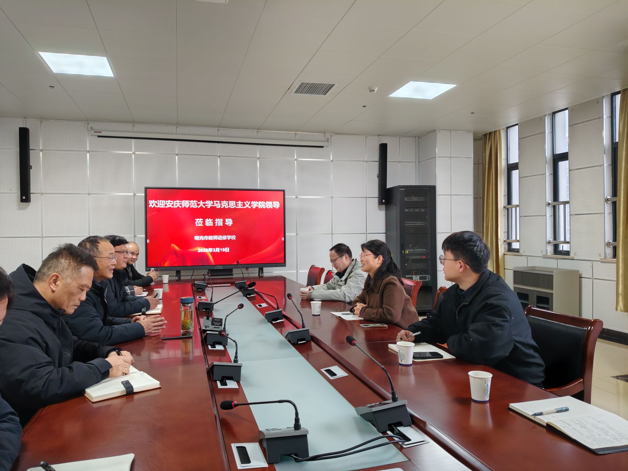 公司一行先后走访明光市第二中学、明光市教师进修学校、明光市阳光学校、明光市第三中学、明光市远翔实验学校,与明光市教体局、各学校负责人深入交流,实地调研各基层学校人才需求、洽谈教师培训合作等,并看望了皖北地区基础教育优质资源扩容工程管理团队的公司张铭老师,慰问了在明光市第二中学顶岗支教的员工。