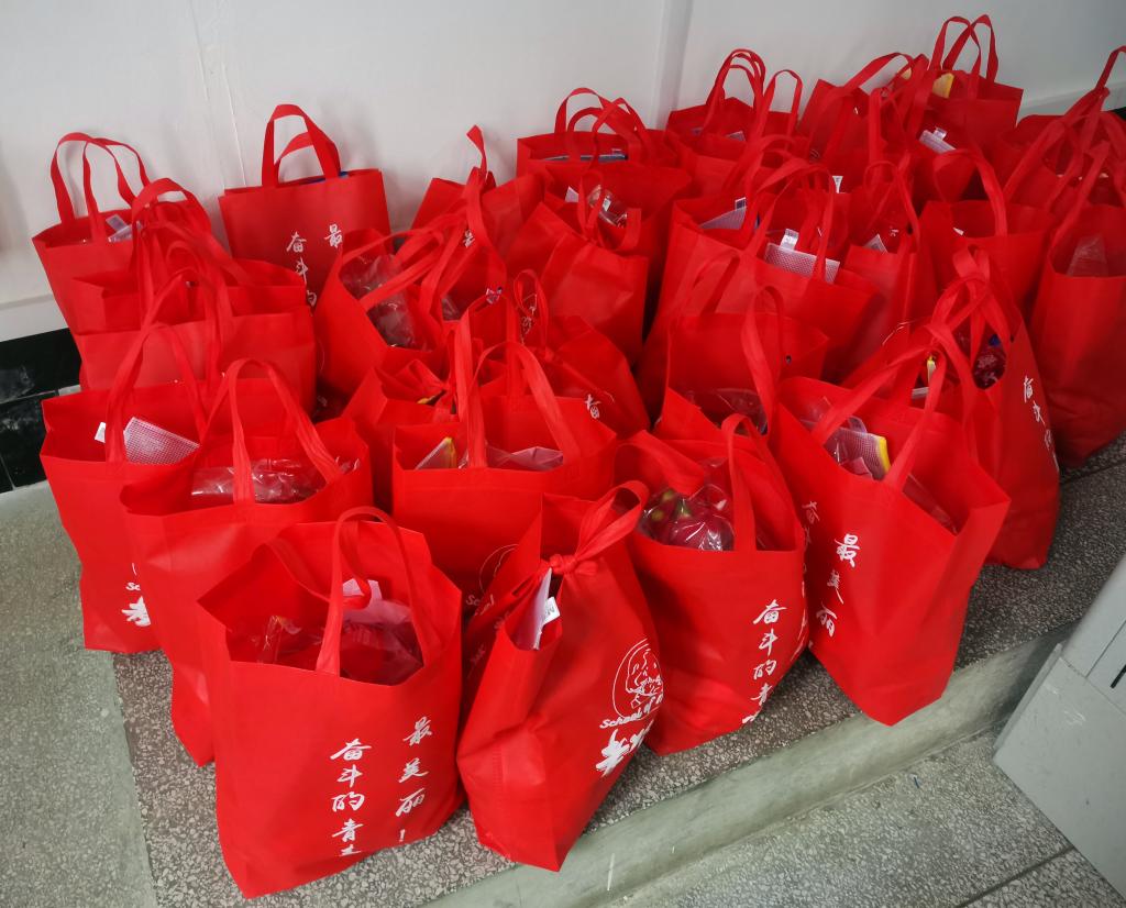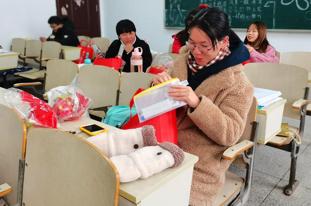 11月26日下午,122cc太阳成集团的57名考研学子在班会上收到学院各级学弟学妹们准备的定制福袋,福袋内装有爱心信、考研必备文具和水果大礼包等花式礼物。比起精神鼓励,考研学子们表示:“这种精心准备的福袋更加暖心。”
