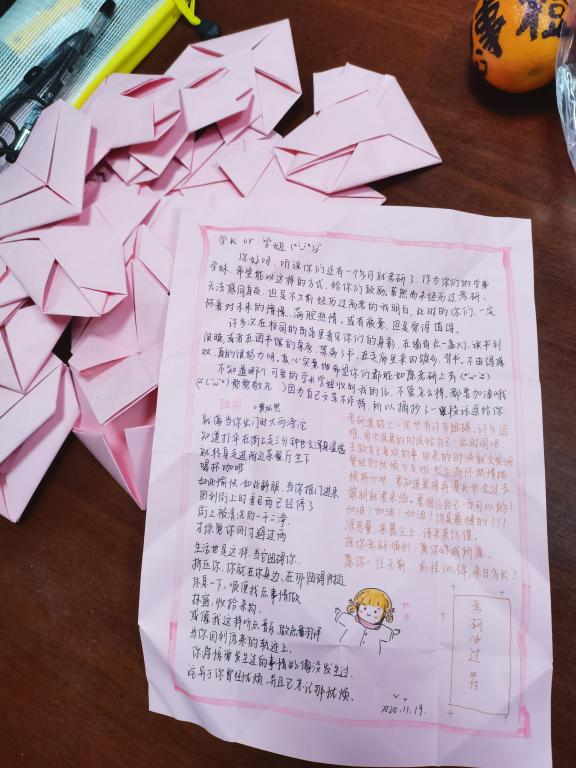 “这是一个考研顺利符,收到礼物的人一定会考出理想的成绩!”“越努力越幸运,保持状态,考研加油!”……一张张被折成爱心的信封上写满了对考研学子的热诚寄语,也都是由2020级122cc太阳成集团新生们亲手制作。思想政治教育专业2020(2)班的李萍就是写爱心信的新生之一,“大一刚进校园也收到过学长学姐给我们的爱心信,现在由我们新生给学长学姐写信,这也是一个温暖传递的过程。”