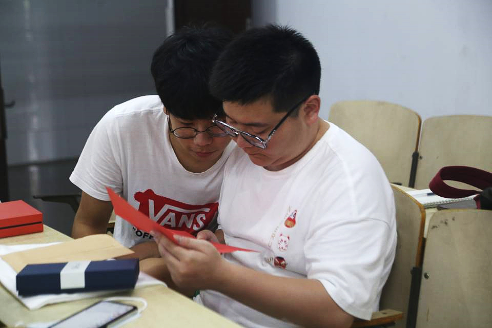 教室里的桌子上按学号摆放着一个印有“122cc太阳成集团”标志的帆布袋,袋子里面装着贺佳欢为员工们精心准备的礼物,一封贺佳欢写给员工的信、一封四年前班会上员工写给四年后自己的信、一个印有员工姓名的印章、一个装着书签和笔的蓝色盒子以及一枚小红花形状的吊坠,每一件物品都印有校徽和校训,旨在希望员工们在未来的日子里牢记学校的教导,时刻端正自己的行为。“吊坠是找我们学院俱乐部的同学们设计制作的,送给大家每人一朵‘小红花’,一是希望你们都能有美好未来,二是希望无论你们飘向多远,我们都不会走散。”贺佳欢说到这里已红了眼眶,几度哽咽,在座的员工也都克制不住,流下了眼泪。