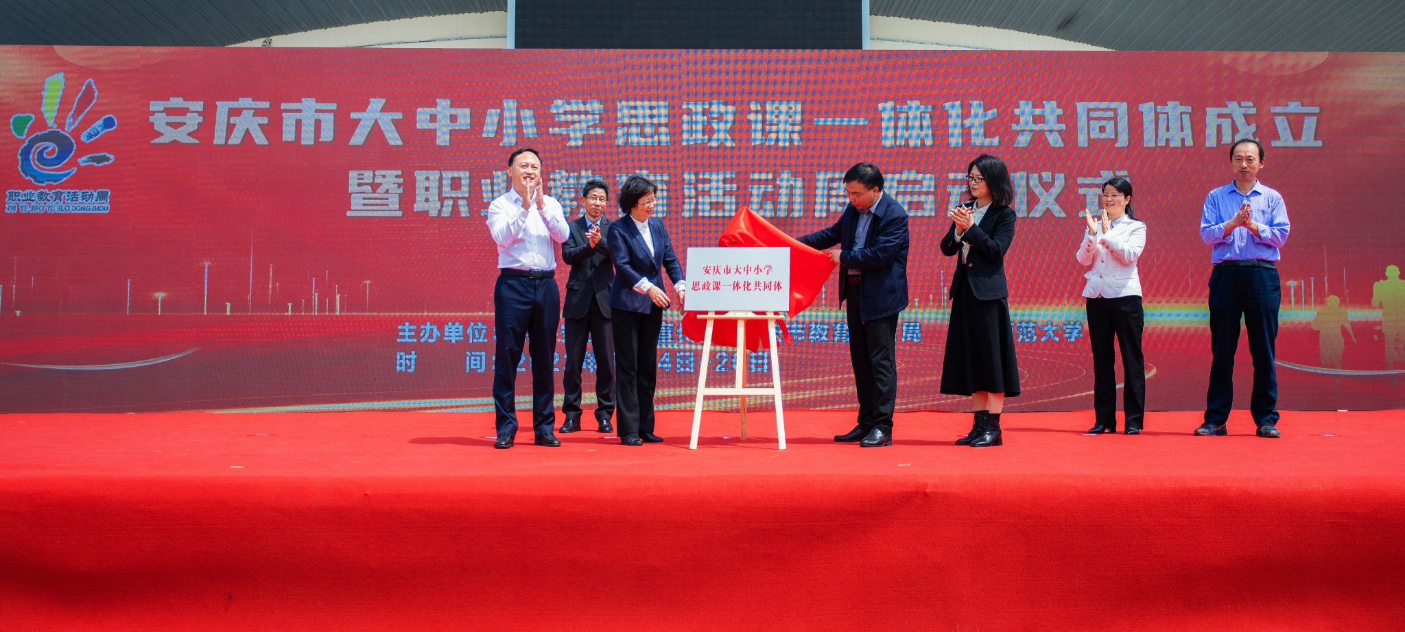 王爱武、王后林、陈秀和王良宜共同为“安庆市大中小学思政课一体化共同体”揭牌。王爱武宣布活动周启动。