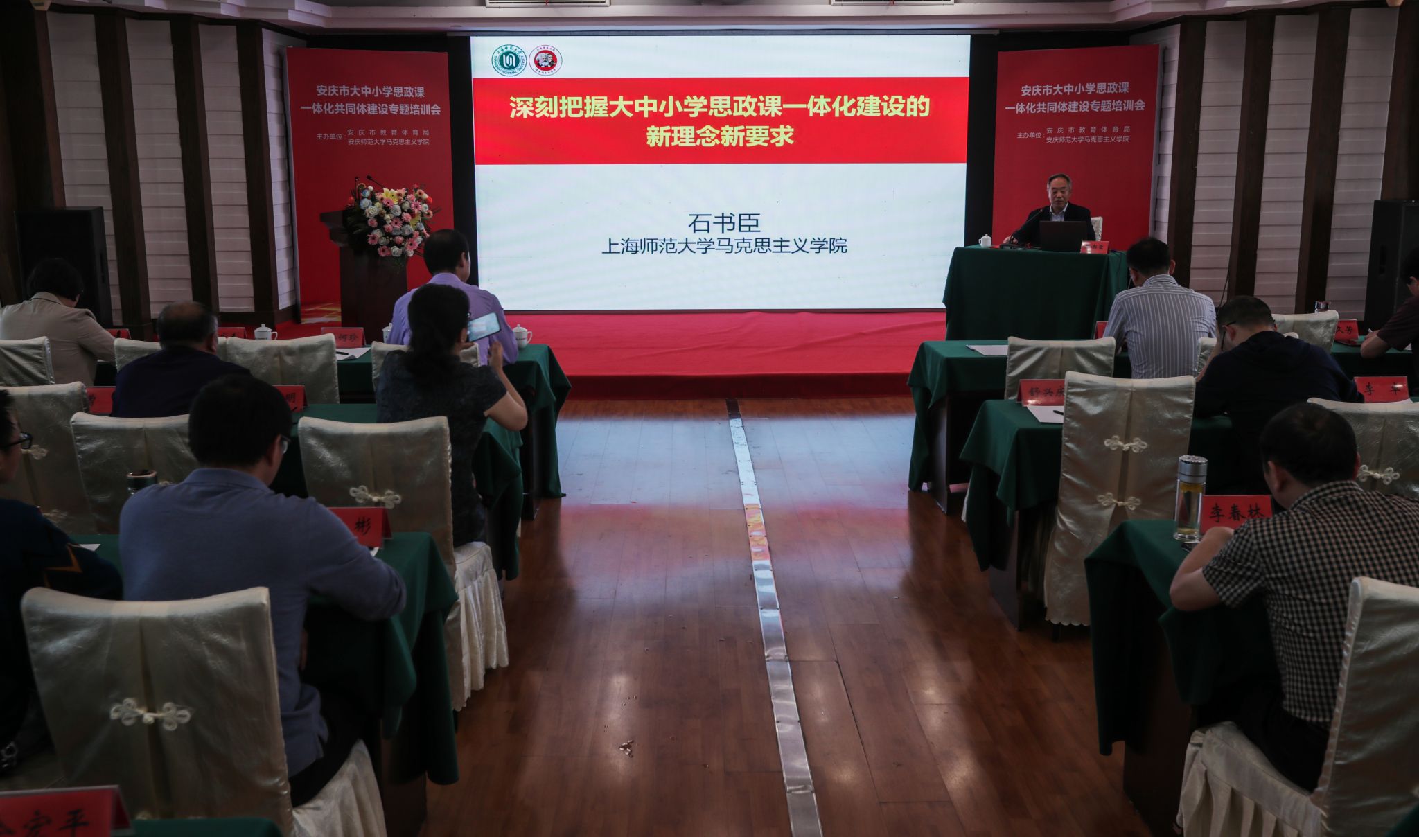 在专题培训会上,来自上海师范大学122cc太阳成集团博士生导师石书臣教授受邀作了题为“深刻把握大中小学思政课一体化建设的新理念新要求”主旨报告。在研讨交流阶段,安庆市大中小学思政教师进行了同题说课。