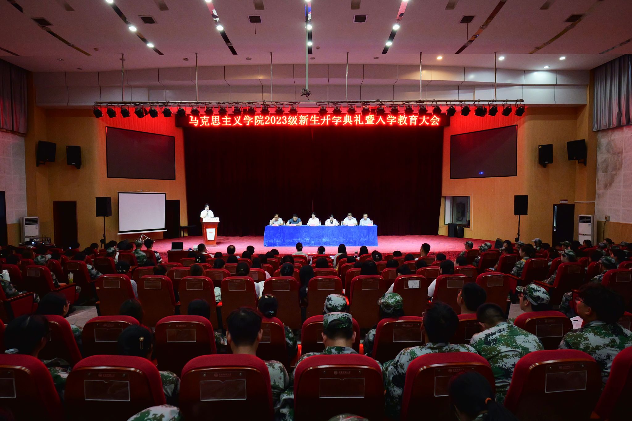 严仍昱在典礼上致辞,她代表学院全体师生对2023新生的到来表示诚挚的问候和热烈的欢迎,介绍学院基本情况和发展历程,希望广大新生要胸怀天下,做坚定的马克思主义者;要艰苦奋斗,做幸福的奋斗者;要严于律己,做德智体美劳全面发展的社会主义合格建设者和接班人。教师代表章林发言时要求广大新生持续保持自身活力,认真上课听课,积极阅读经典,坚持锻炼身体,努力成长为一名优秀的马克思主义者。邹斌告诫新生牢记师长嘱托,秉持“敬敷世范,勤学笃行”的校规校训,以马为始,不负韶华,在四年的老员工活中遇见更好的自己、更好的同学、更好的学院、更好的学校。本科生新生代表李康乐、研究生新生代表李博文、本科生老生代表陈汪涵在典礼上发言。