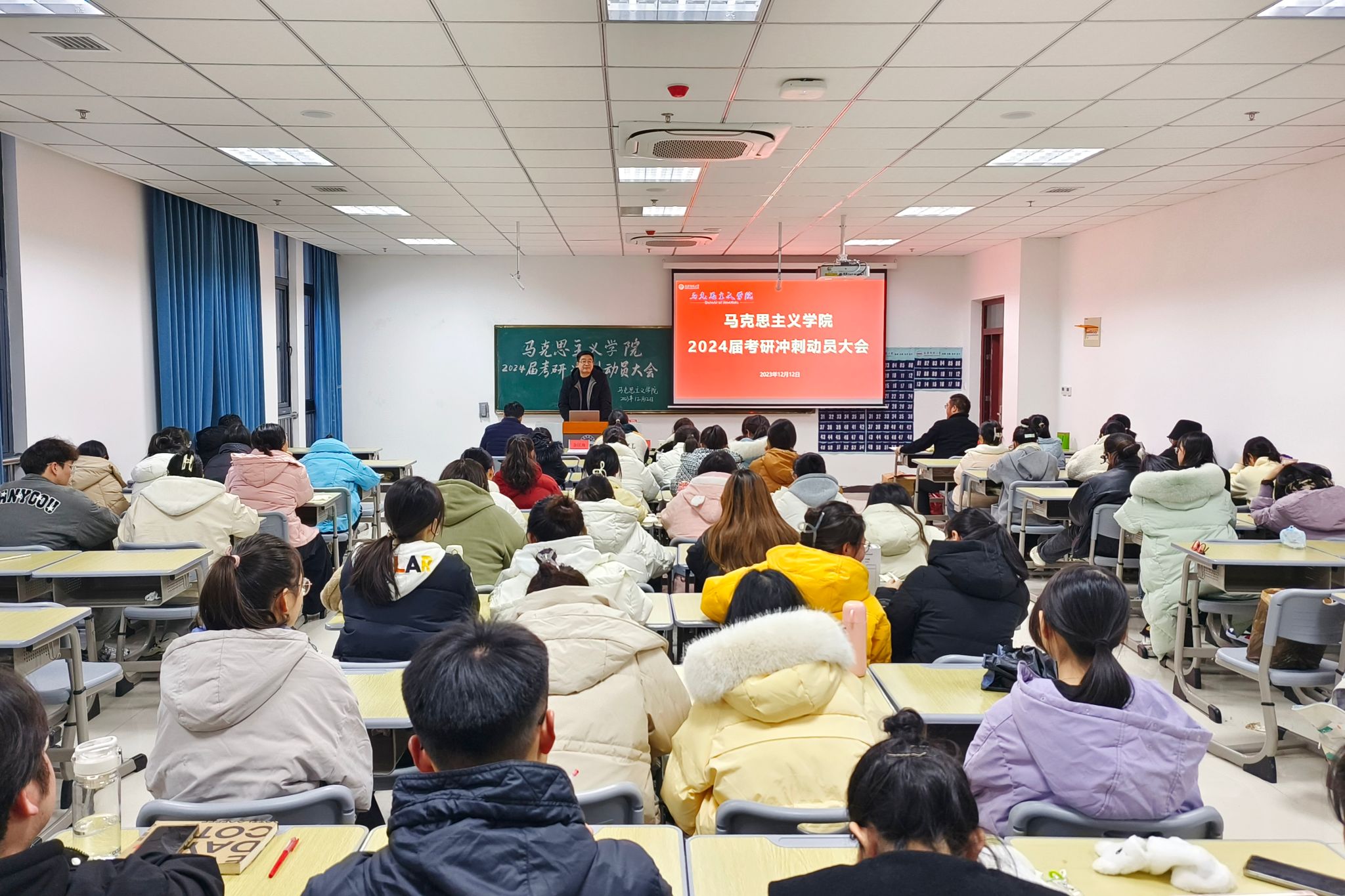 12月12日,学院在Q楼212教室举办2024届考研动员大会,全体考研员工、毕业班辅导员及团委负责人参加此次会议。学院副经理张俊生,学院教师檀传杰、张铭、张二远出席动员大会。