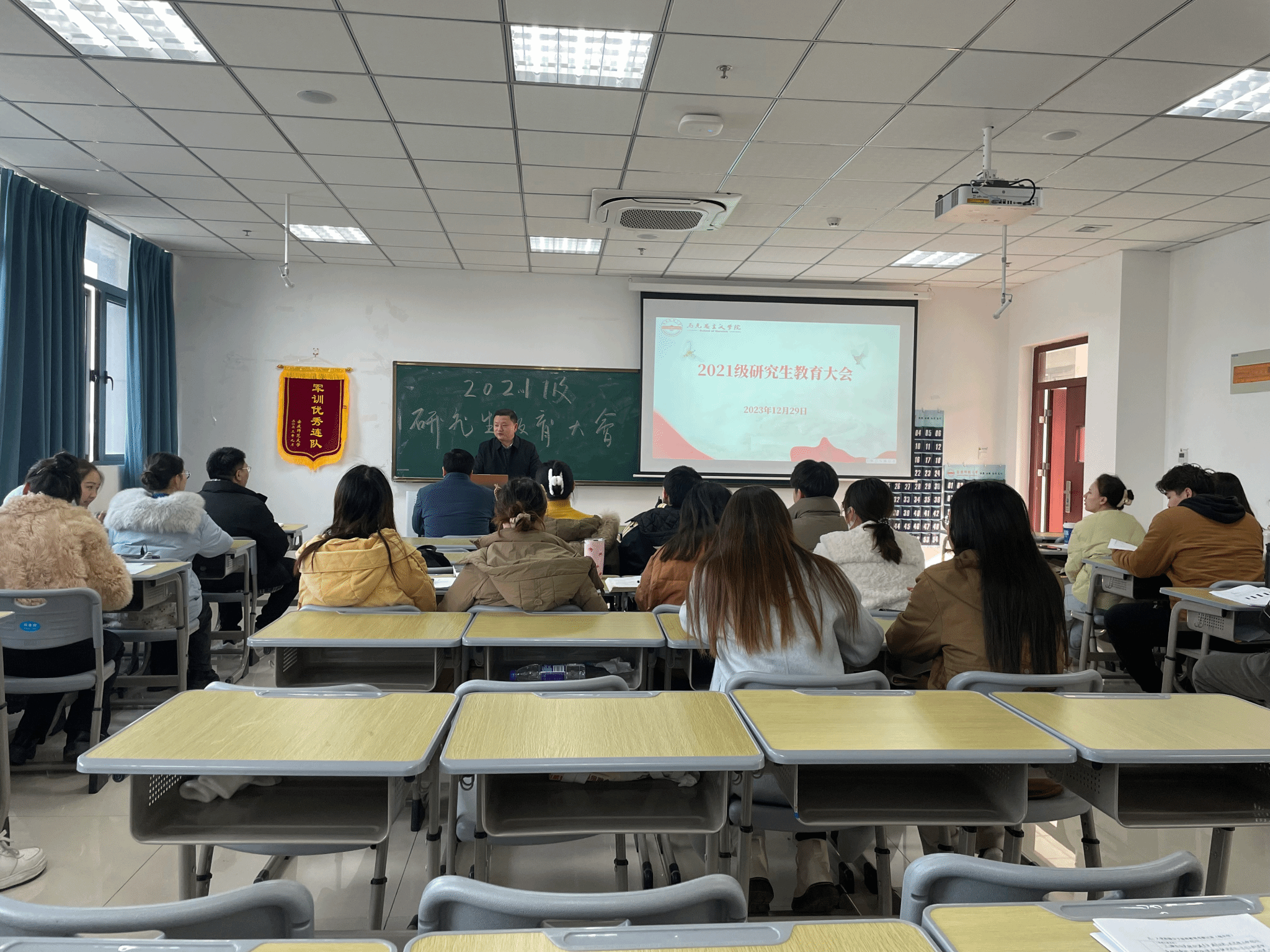 12月29日,学院在Q304教室召开2021级研究生教育大会。公司党委副书记邹斌、学院副经理张俊生、研究生辅导员徐雯钰以及2021级全体研究生参加会议,会议由研究生秘书赵贺主持。