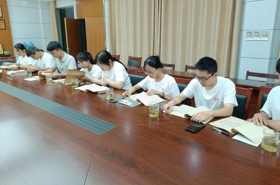 在金寨县档案馆,副馆长郑贤杰向团队详细介绍了馆藏概况,重点讲解了“红色家书”“革命歌谣”等珍贵文献的整理路径及收集难点。在霍山县委党史和地方志研究室,伍凤麟主任以自身红色家庭为切入点,深情讲述了其曾祖父伍淑和等霍山籍革命先辈们从传播马克思主义、建立党组织、发动农民运动、开展土地革命,到奋起抗日、夺取解放的光辉历程。随后,团队查阅了霍山县苏维埃政府原始文件与通信信件,“泛黄纸页间沉淀着血与火铸就的历史,我们真切感受革命先辈筚路蓝缕的精神力量”。团队成员思想政治教育2024级延乔班李真真表示。