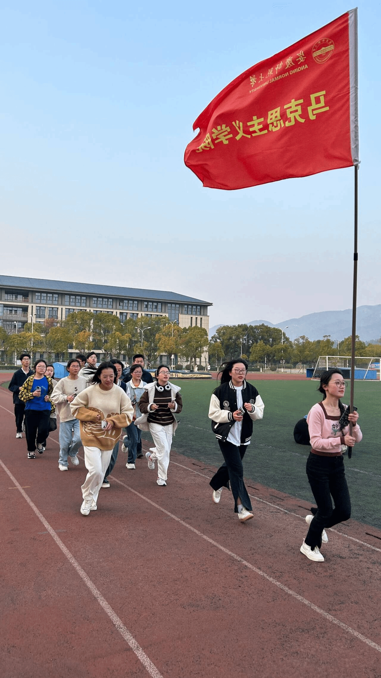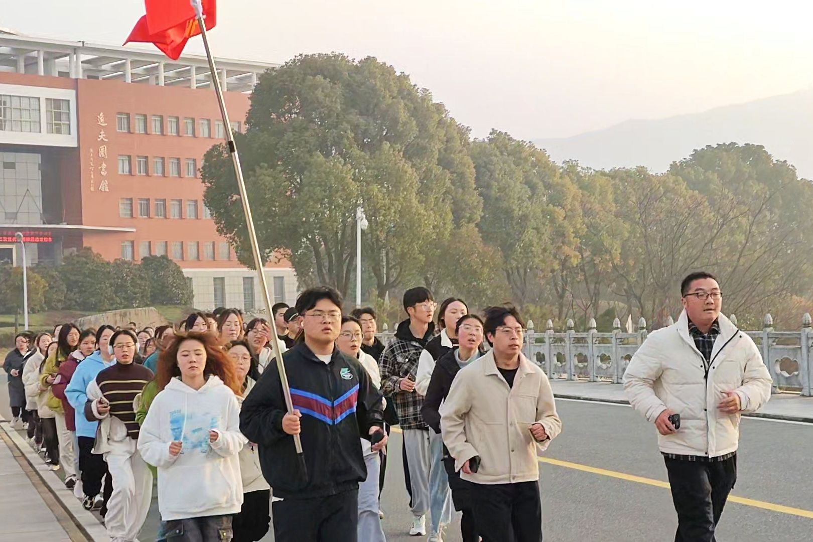 早上7时10分,同学们在经过充分的热身运动后迈着整齐的步伐从敬敷广场出发。大家按照规定路线有规律地摆臂、跨步、呼吸······在早晨的第一缕阳光中展现出青春的活力和风采。“敬敷世范,勤学笃行,马院姓马,在马言马!”踏步声、口号声、老师们的鼓励声,让校园内顿时呈现出一片积极向上的蓬勃朝气。本学期的阳光长跑分为晨跑和夜跑,晨跑活动于每周一早晨围绕双龙湖开展,夜跑活动于每周三、周五晚在南操场进行,全程大约2.2公里。