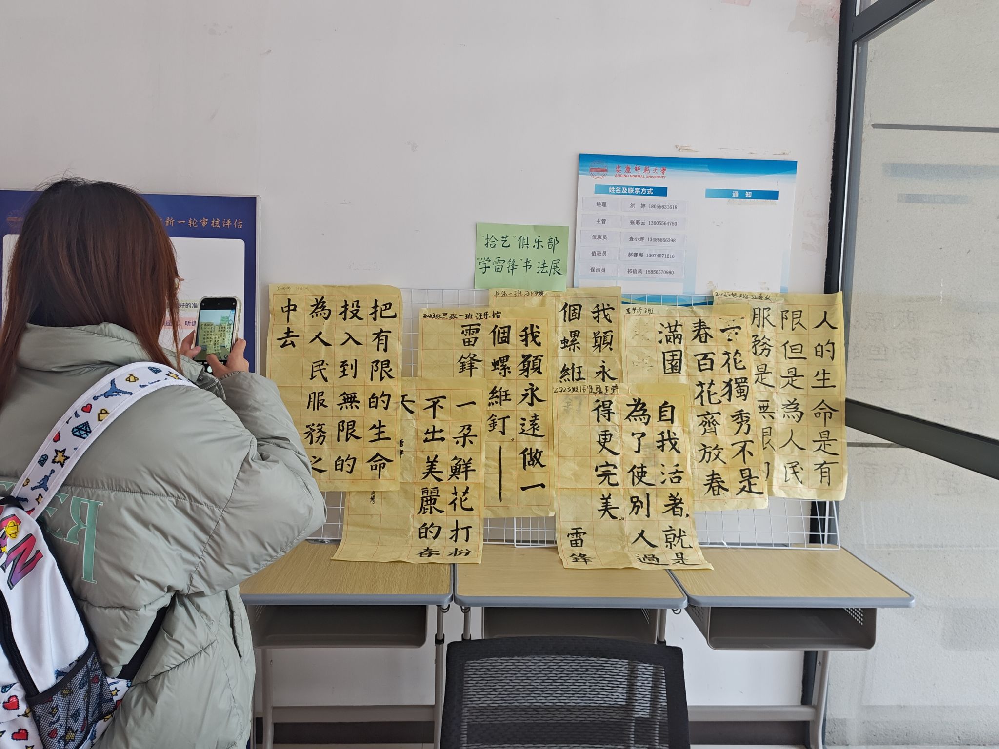 遒劲端正的楷书、活泼有神的行书、放荡不羁的草书……桌上摆放着各式字体的书法作品,引来了员工们的驻足围观和拍照纪念。活动负责人、思想政治教育专业2022级(2)班罗慧柳介绍,这些作品都是由学院“拾艺”俱乐部成员誊写,工作人员提前一周收集并挑选出优秀作品进行展示,“此次书法展为同学们提供了一次充分展现自我的平台,以及热爱祖国、甘于奉献的崇高理想和坚定信念。”