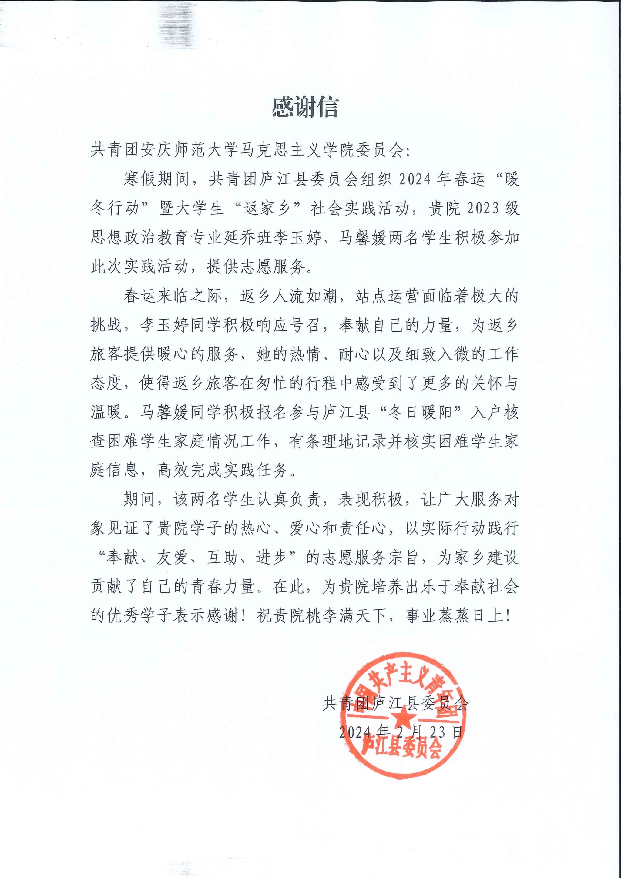 寒假期间,2023级思想政治教育专业延乔班共18人次参加,占班级人数的64.28%。思想政治教育专业2023级延乔班李玉婷参加了返乡潮高铁站服务志愿活动与社区服务,她在谈及本次活动中说到,“这次实践活动为我们青年创造了一个更深入理解社会、服务社会的平台,作为一名思想政治教育专业的员工,我会将本次的收获与所学专业知识融合,在未来为更多人提供更优质的帮助,为家乡和社会发展贡献力量。”思想政治教育专业2023级延乔班张子琪主动报名参加了由共青团蚌埠市委员会、蚌埠市交通运输局联合举办的蚌埠南站交通执法实践活动。通过寒假的“返家乡”社会实践活动,不仅增长了知识、提升了能力,更重要的是增强了对家乡的归属感和对社会的责任感,也丰富了个人志愿服务经历。