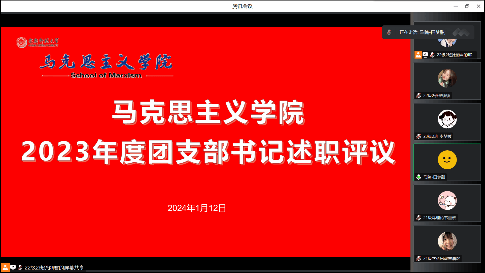 1月12日,学院团委组织开展2023年度团支书述职评议工作。学院团委委员、各班级团支书共20余人参加,学院团委副书记田梦甜、团委教师兼职副书记金炜康出席会议。