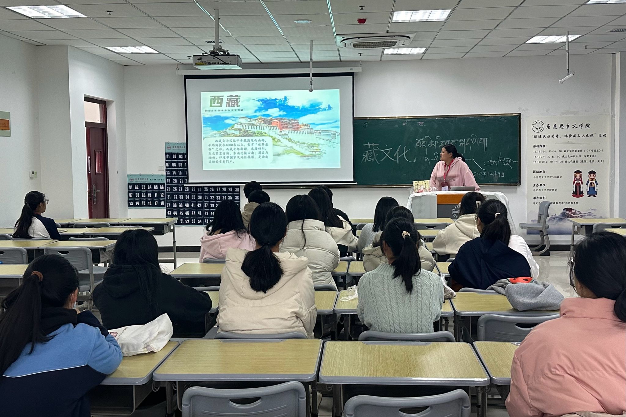 12月6日,学院“敬敷思源”志愿服务队在Q楼308教室开展“促进民族团结,体验藏族文化之旅”藏文化电影播放活动,学院同学积极参与,现场文化气氛浓厚。