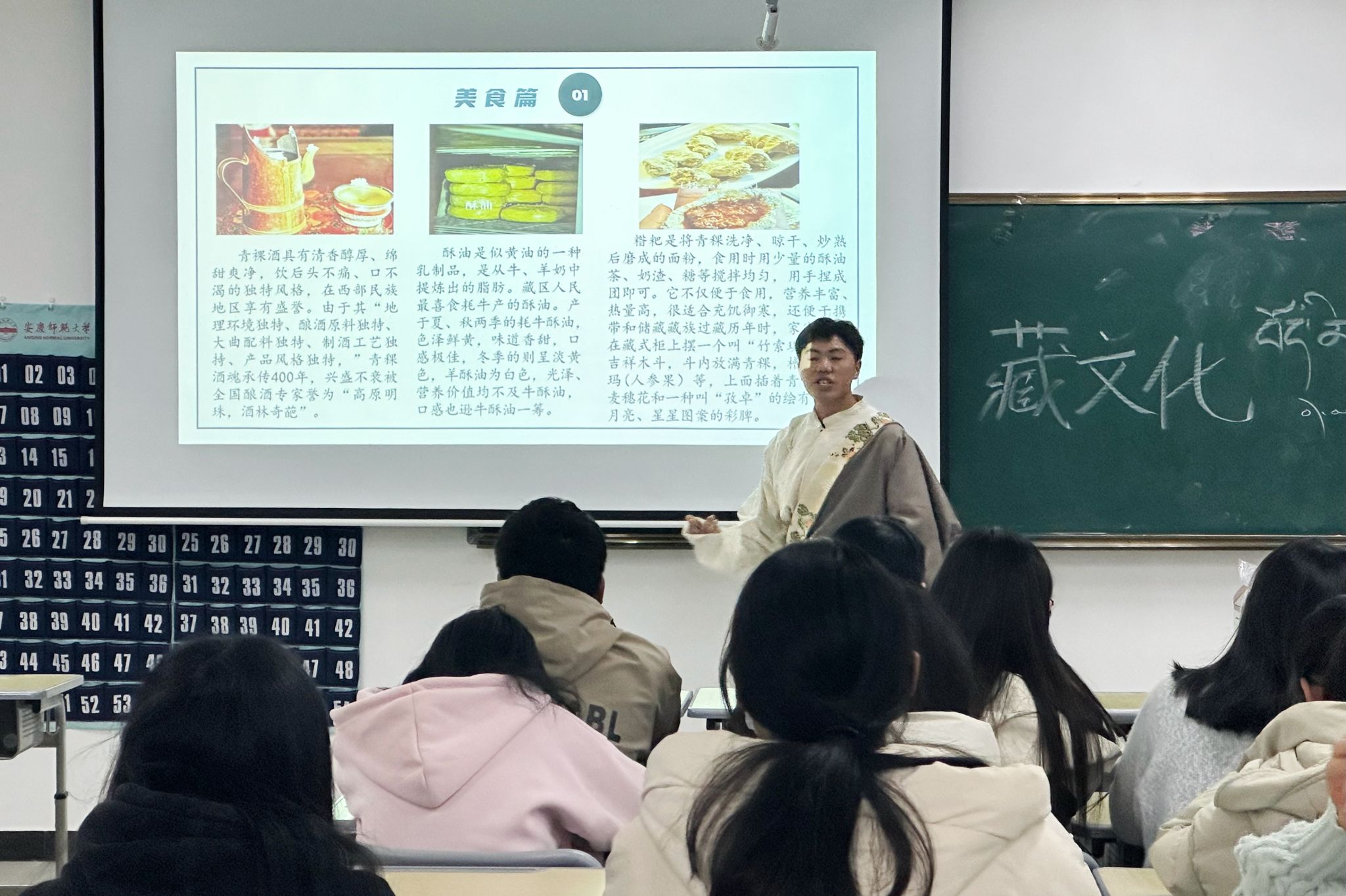思想政治教育专业2023级(3)班其美拉庆与平措卓玛从藏文书法、藏歌及服饰、风俗习惯与旅游美景四个方面向大家介绍西藏。平措卓玛在现场教同学们说藏语并带动大家一起唱藏歌,成功激发起大家的学习兴趣。身着藏服的其美拉庆通过视频与图片给大家详细介绍了藏族的节日和饮食等极具民族特色的文化。活动以藏文化知识竞答结尾,在座同学们根据今天活动学到的藏族文化知识积极回答问题。