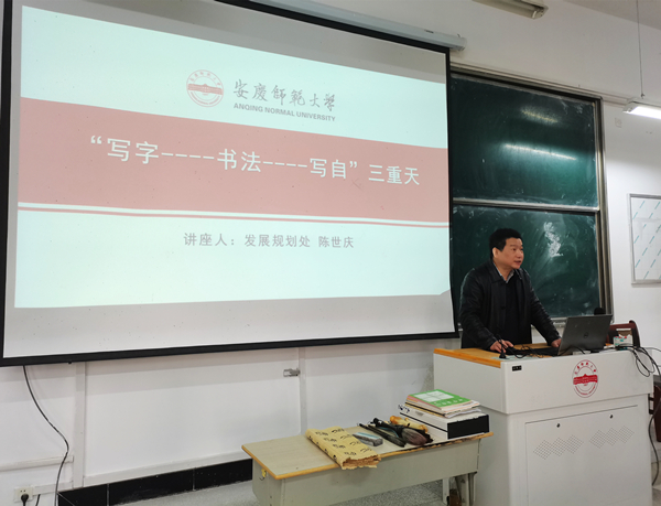 12月8日,学院在龙山校区稼先楼100室举办“思政大讲堂”之“赓续红色传统,规范汉字书写——师范生技能专题报告会”。本次报告会特邀公司党委委员、发展规划处处长、硕士研究生导师陈世庆为学院青马班成员及员工代表共计120余人作“‘写字——书法——写自’三重天”的专题报告。报告会由公司党委书记金文斌主持。