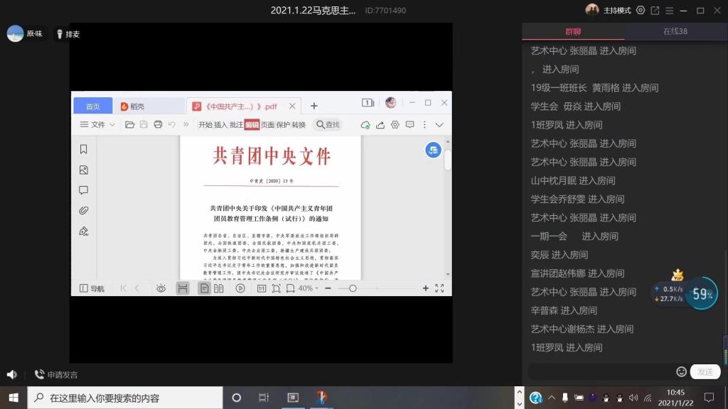 2021年1月22日,学院团委召开线上学习会议。学院团委副书记贺佳欢组织员工集中学习《中国共产主义青年团团员教育管理工作条例(试行)》,并对下学期的工作进行部署,提出要求。