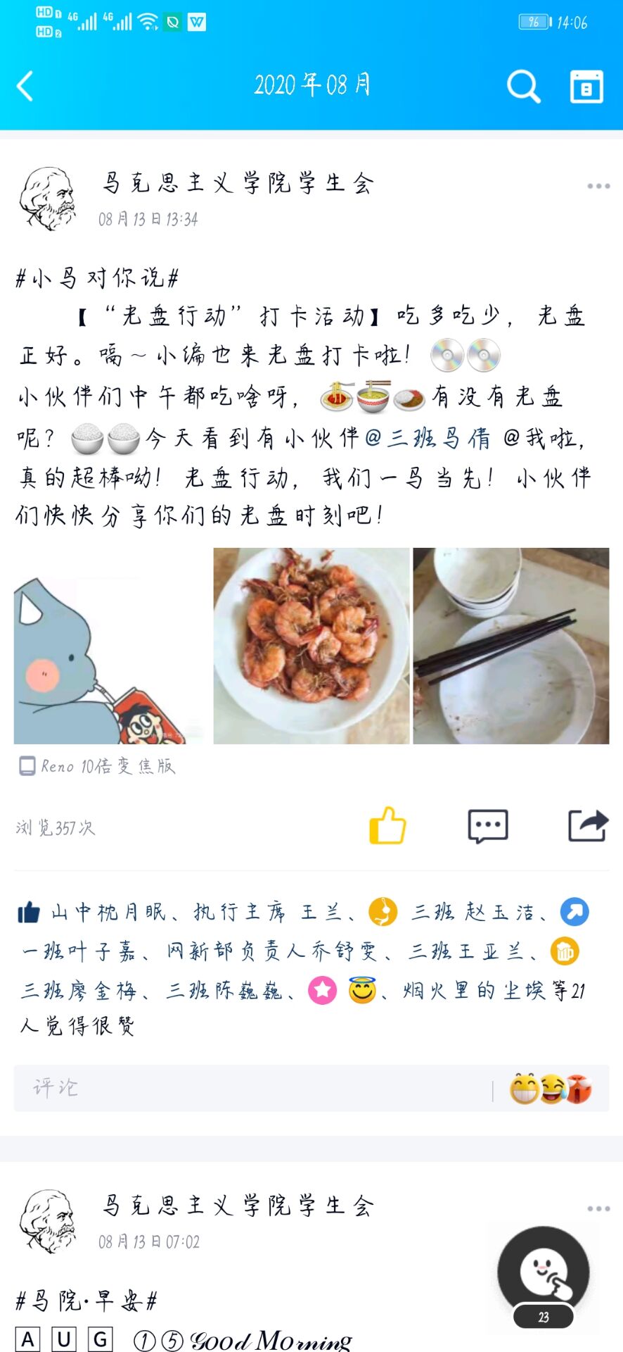 为了让更多的员工了解“光盘行动”、支持“光盘行动”和参与“光盘行动”,积极响应习近平总书记制止餐饮浪费行为的重要指示精神,学院团委组织开展线上推文学习和打卡活动。学院倡导同学们认真学习《人民日报》上刊登的《习近平:坚决制止餐饮浪费行为》内容,同时鼓励大家就“光盘行动”、“餐饮浪费”等内容进行交流探讨。同学们积极参与其中,思想政治教育专业2019级3班侯骏逸在参与讨论时说,我们应该将光盘行动常态化,光盘行动,文明就餐应当成为每个人的日常习惯。“近年来,餐饮浪费的现象层出不穷。制止餐饮浪费,培养节约习惯,是每一个公民应当肩负的责任。作为青年老员工,我们更应该从自身做起,勤俭节约,艰苦奋斗”,则是思想政治教育专业2019级1班黄雨格针对当今“餐饮浪费”的现象提出的观点。