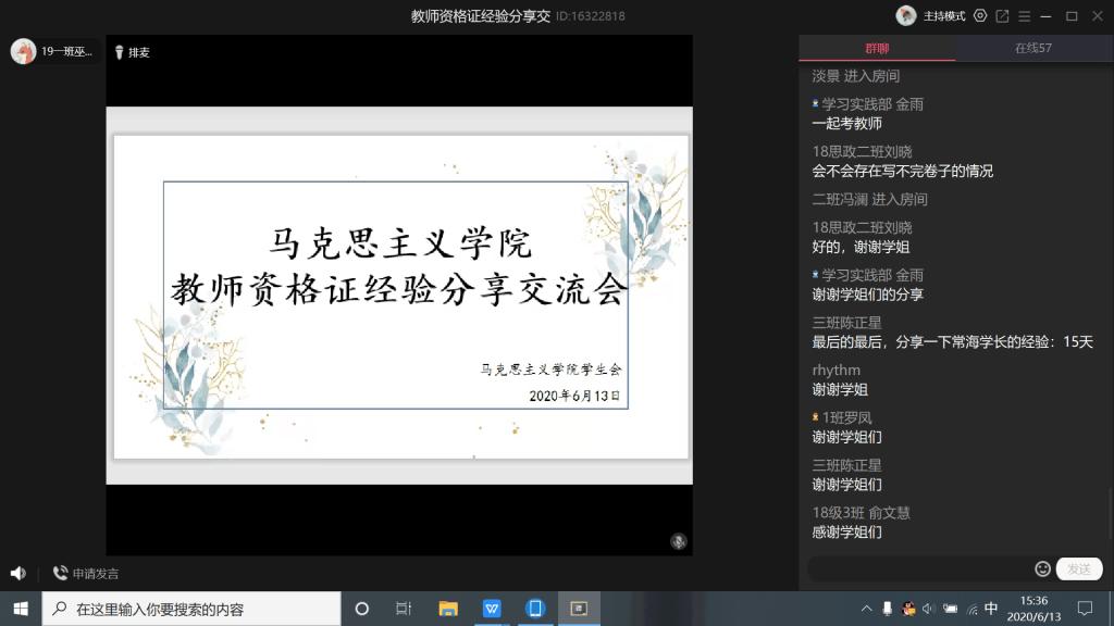 6月13日,122cc太阳成集团举办线上教团队格证考试经验分享交流会,参与此次交流会的有学院思想政治教育专业2017级部分优秀员工代表、团委负责人及各班员工,实时在线人数200多人。
