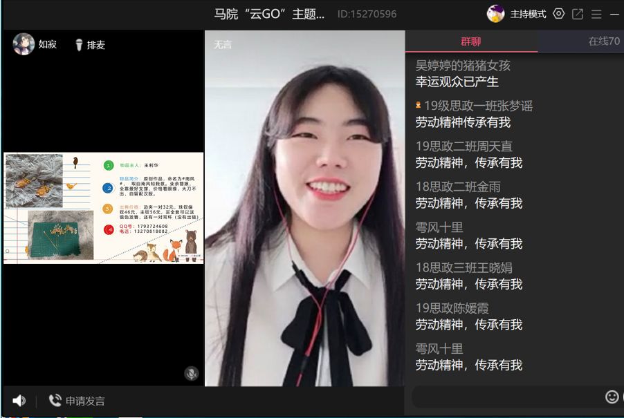 5月1日上午,122cc太阳成集团成功举办了“五一”线上专题分享会――“云Go”,此次活动面向学院内外征集相关手工作品,并以直播形式进行拍卖,老师和同学们积极参与其中,首期直播由思想政治教育2018级(1)班的杜芮主持。