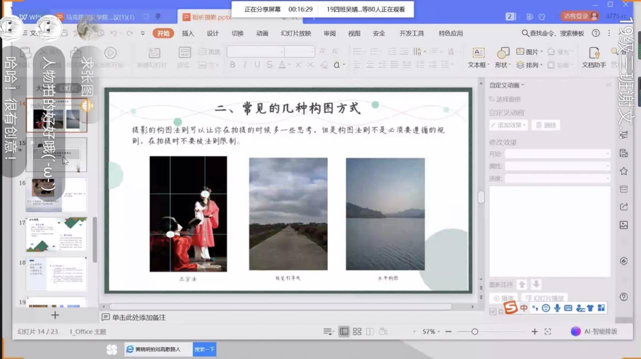 新闻稿的撰写和活动照片的展示,是一篇新闻报道不可或缺的组成部分。“一张好的照片,能带给人一种持久的震撼。”手机摄影、摄影的构图法则、纪实摄影的认识是传媒学院广播电视学专业2018级(2)班的李玉衡为我们带来的知识分享。“注重摄影的构图可以更好的带入主题,表达图片的主次,展示作者的情绪”,他介绍了常见的几种构图方式,如“三分法”“视觉引导线”以及“水平构图”。此外,他对于大家颇为关注的会议摄影方面提出了建议:注意图片主题的突出,人物神态的自然以及摄影角度的选择。
