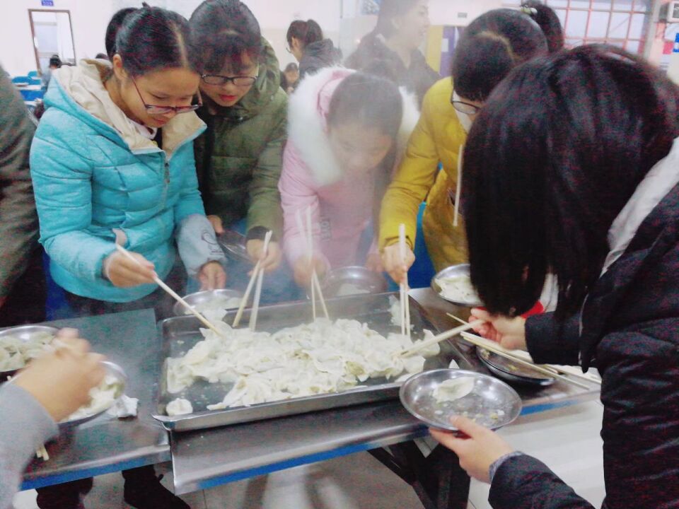 活动现场,七十余名员工分成七组,每组配备至少一名会包饺子的同学进行指导。饺子馅、饺子皮、盘子、勺子、盛水的碗……同学们准备得精心又细致。活动分两阶段进行,第一阶段比包饺子速度、花样;第二阶段比吃饺子、真心话游戏。小小的餐厅里,同学们忙的热火朝天、不亦乐乎。女同学心灵手巧,包出的饺子精美别致;男同学也不示弱,不满足于传统饺子的形状,他们试着玩起各种新造型,形式各异的饺子渐渐腾空而出。当一盘盘热腾腾的饺子新鲜出锅时,大家拿着碗与勺,争先恐后地品尝自己亲手包的饺子。餐厅里笑语连连、热闹非凡。
